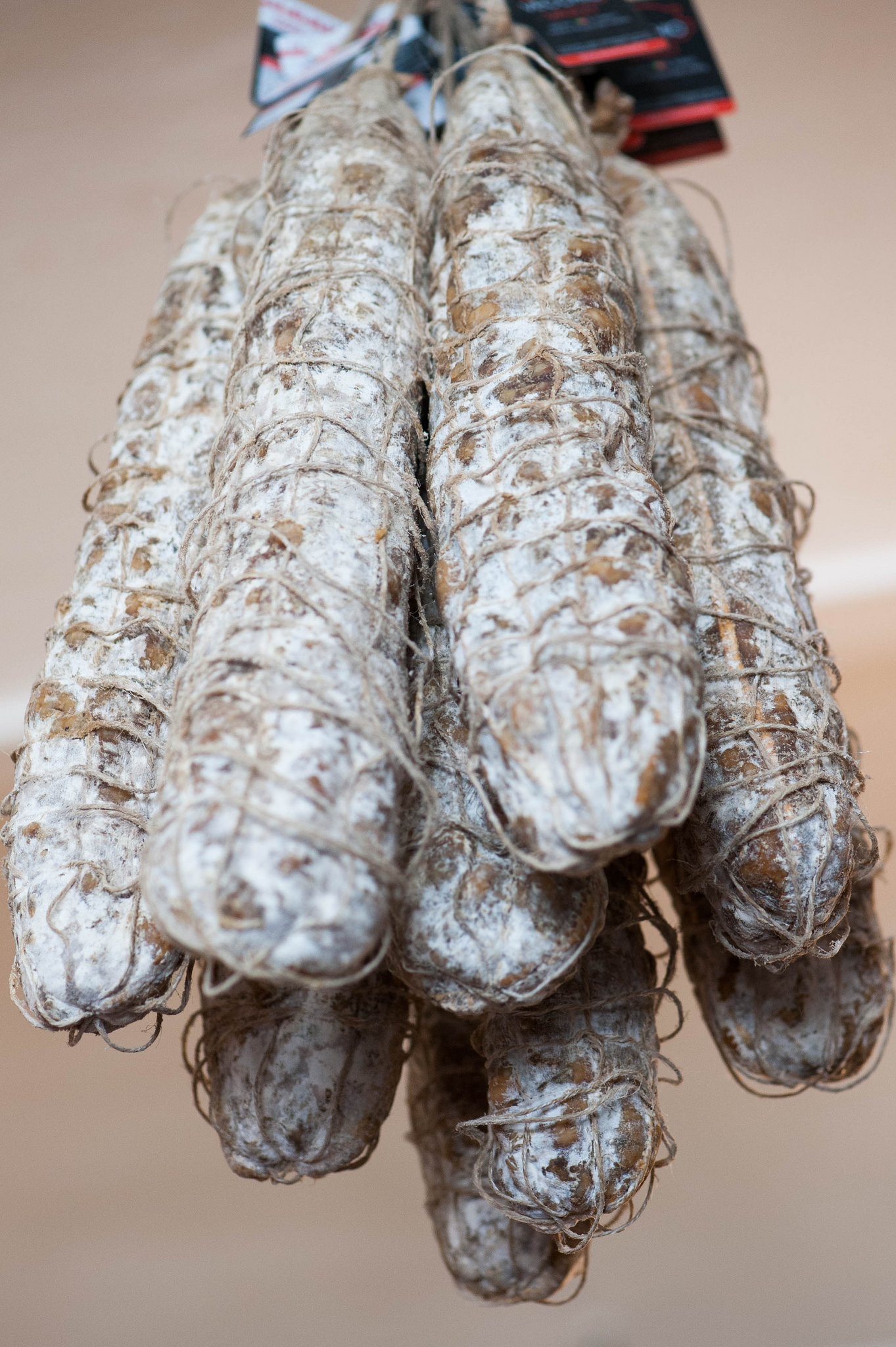 Der kleine Gastraum ist prall gefüllt mit ausgezeichneten Weinen und Köstlichkeiten aus der Region. Von der Decke hängen gereifte Spezialitäten wie Prosciutto, Culatello und verschiedene Salamis.
