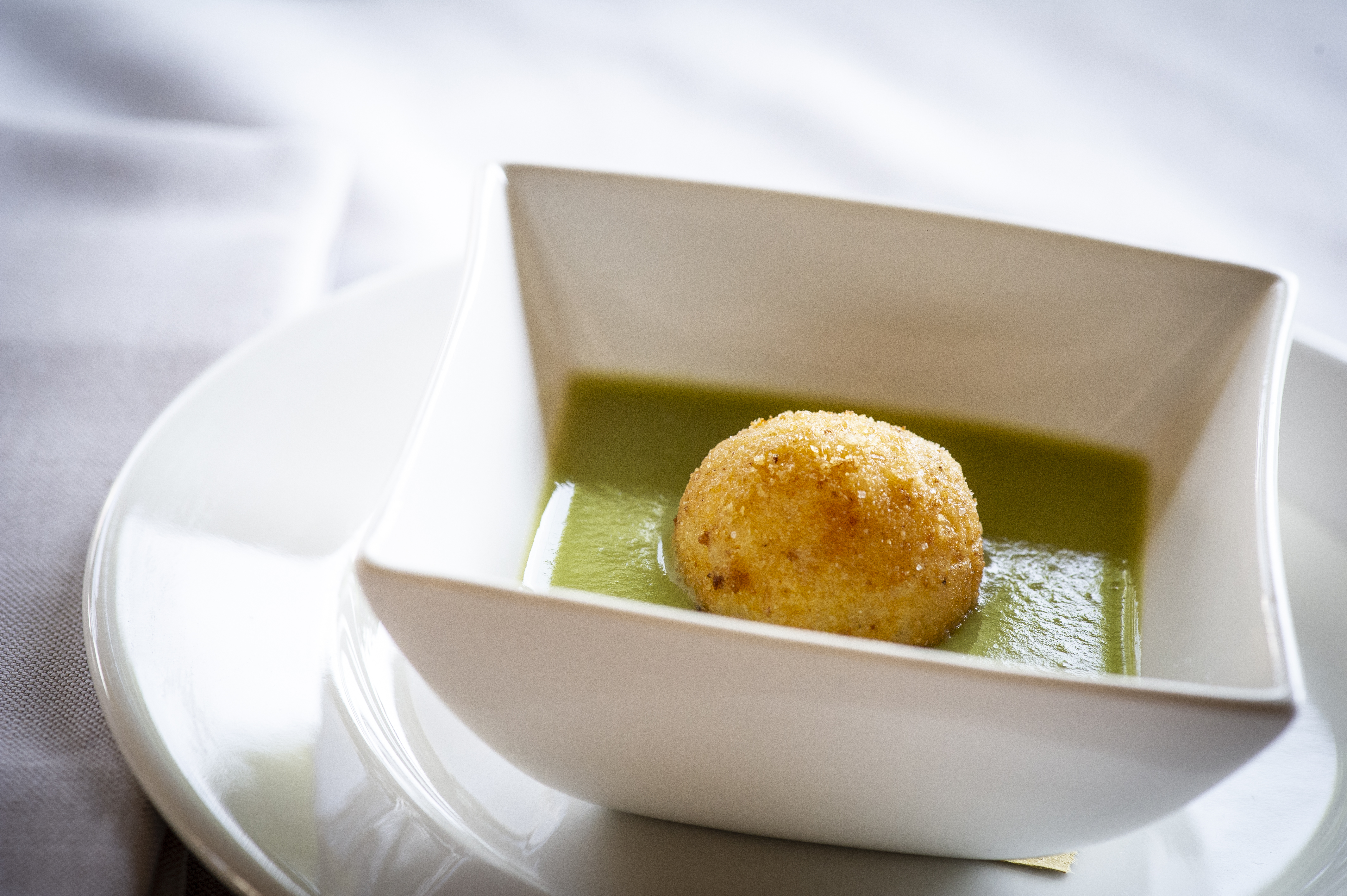 Das Degustationsmenü umfasst 4 – eigentlich sind es 5, nein 6 – mit dem Gruß aus der Küche gar 7 Gänge, und einer ist großartiger als der andere. Als ersten Gruß schickt die Küche eine frische Erbsencrème mit frittiertem Käsewürfel. Ein guter Start. Aber dann kommt das Fleisch. Carne cruda di fassone. Allerbestes rohes Fleisch von einer autochtonen piemontesischen Rinderrasse. Olivenöl, Steinpilze darübergeraspelt (oder Parmeggiano, wenn grade keine Steinpilze herumstehen). That’s it. So geht Beef tatare, Ihr Cognac-, Paprikapulver-, Kapern- und Eidotter-Weicheier.