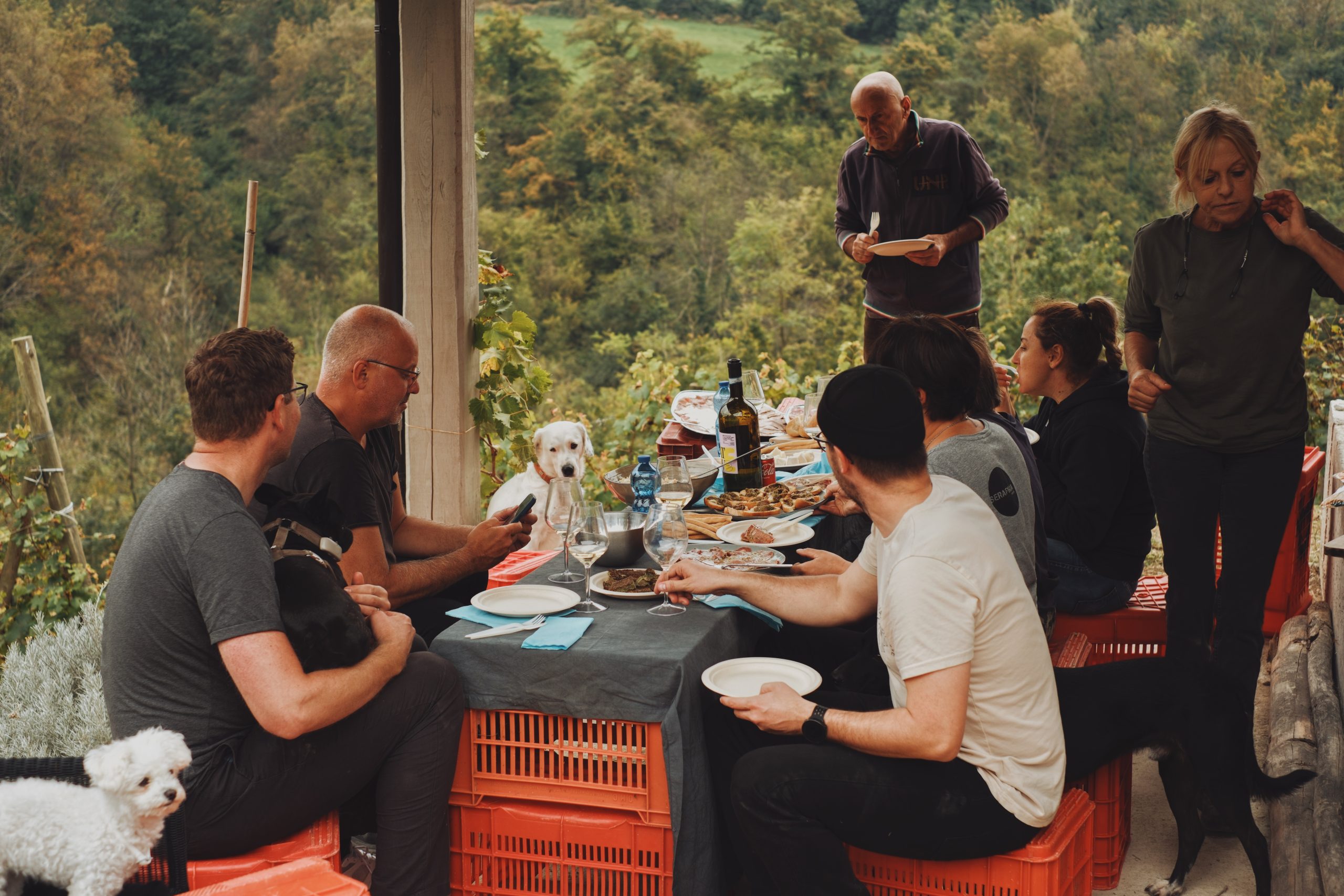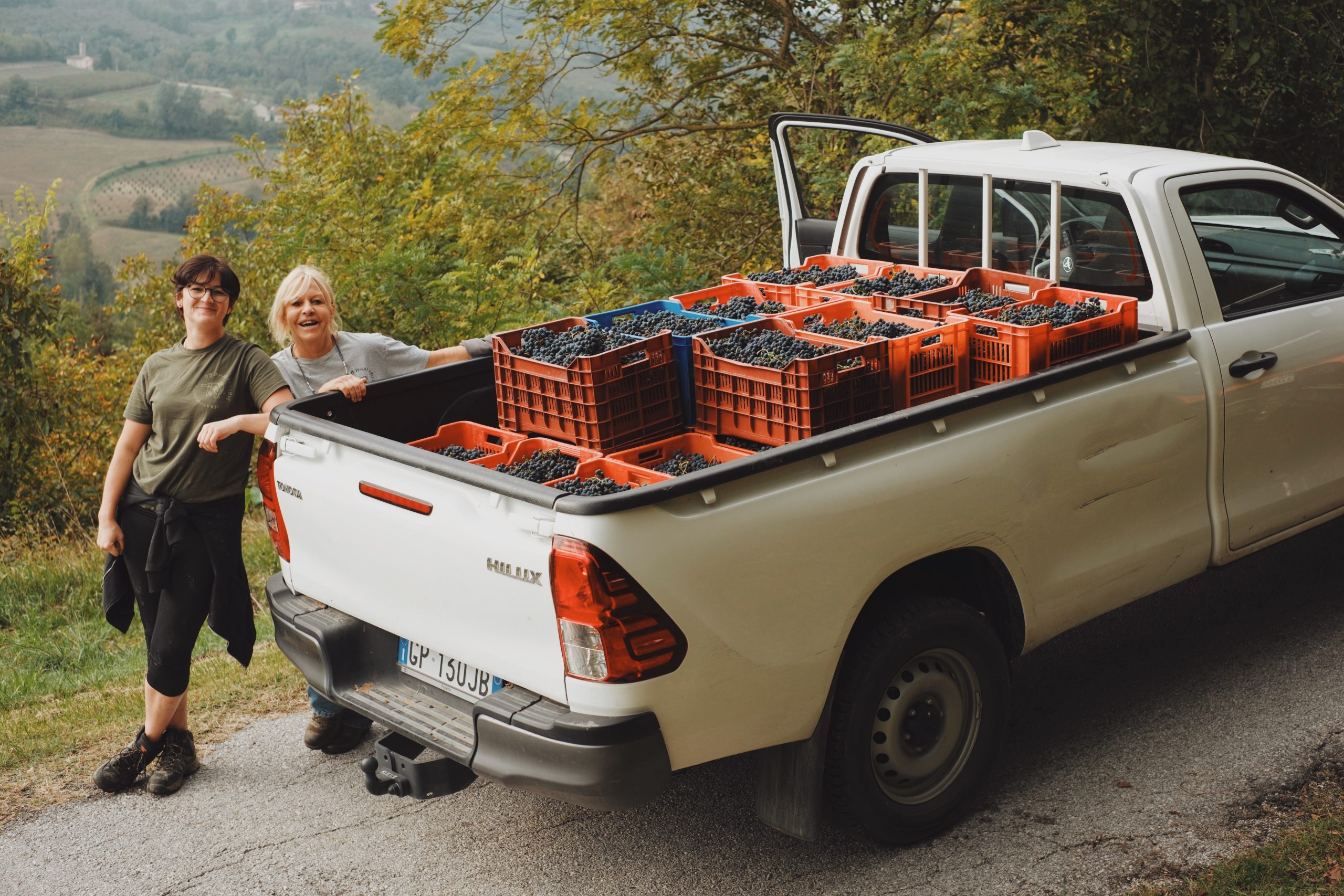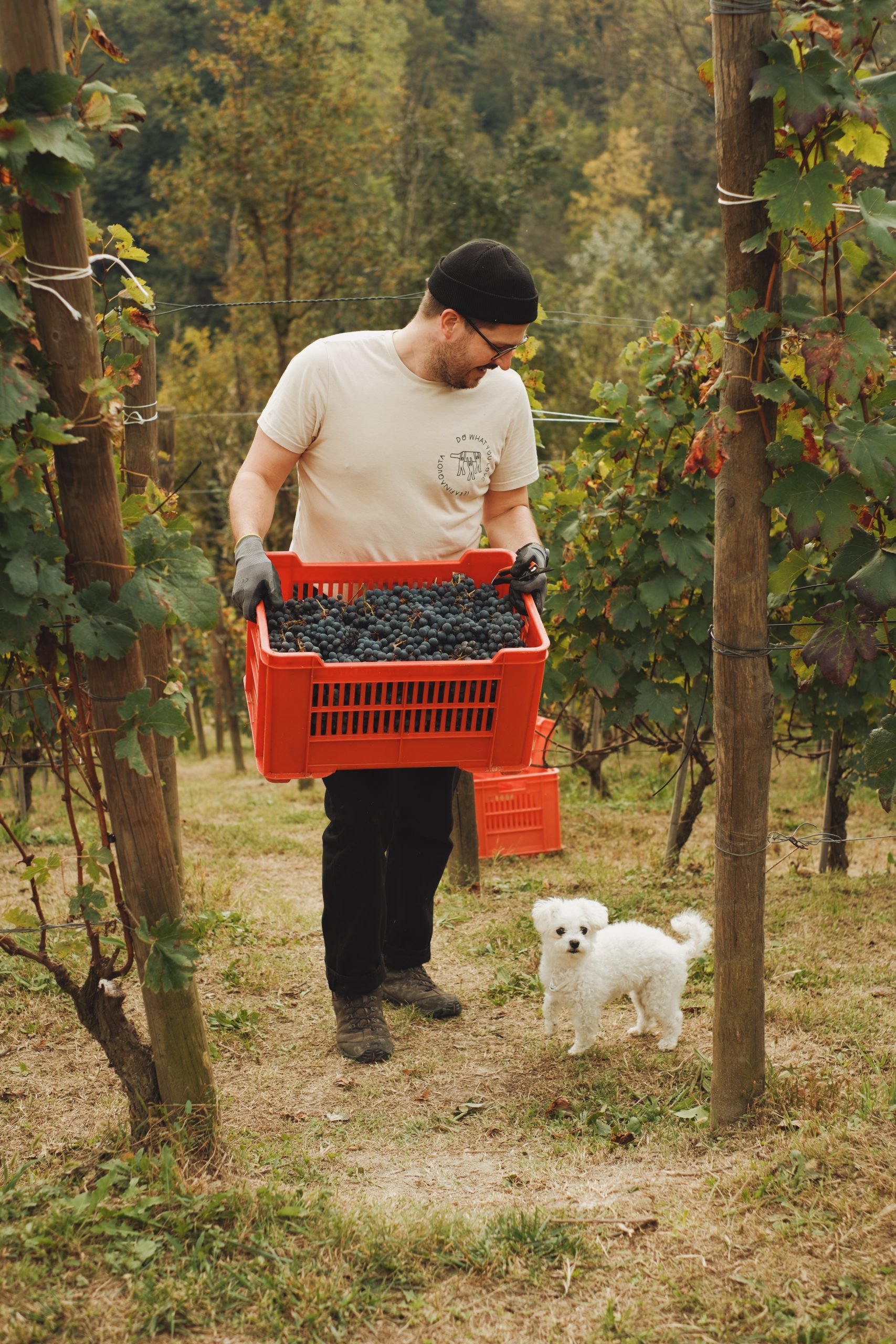 “Controllo!” Miky calls out frequently, reminding us to check the backs of the plants — and collect the hidden grapes too. There we were, back among the Serafina hills again, now accompanying some more experienced friends — and friendly ones — helping out to collect the catch. The first harvest is for the Pinot Nero, which is ready slightly earlier than its neighbours on these hills. With sturdy boots on our feet, and armed with pruning shears, we set off to the hill. Our dog Lilla follows closely like a supervisor, while her local male friends, Alfredo and Pako, play together wild and free. Together, we filled the boxes with grapes, carried them to the sides of the steep hills where Dominik, the winemaker, could access to collect them with a small truck-a-like. During the following days and weeks, we’re happy to participate in so many others — almost like collecting stamps in a harvesting pass of Piedmont: Barbera, Dolcetto, Nebbiolo — and finally, Nebbiolo for Barolo.